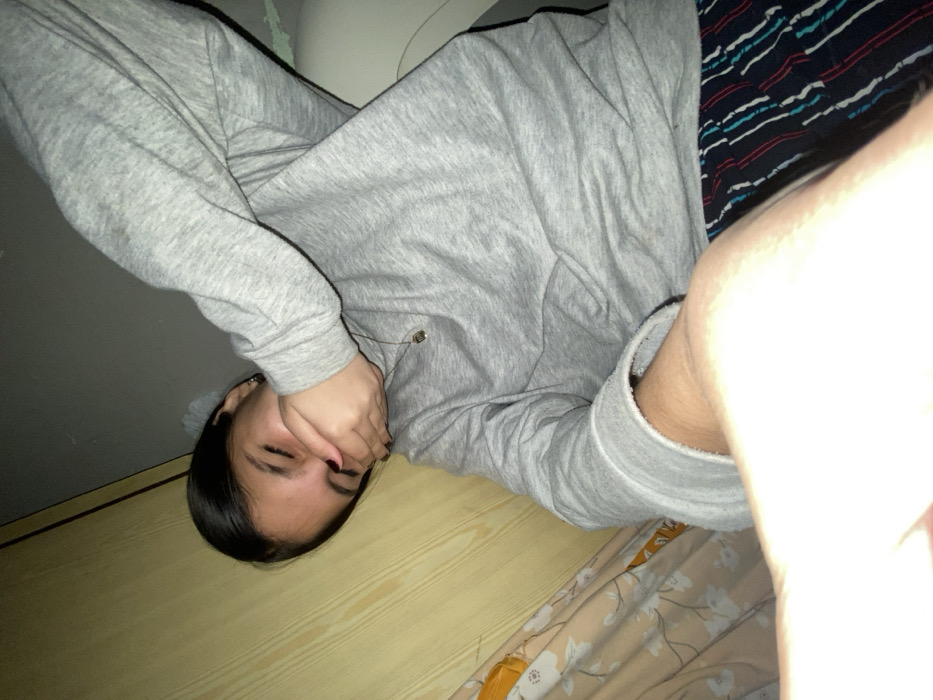An indoor scene in the city of Cotoperíz, Venezuela, depicts a young individual with dark hair pulled back. The individual is wearing a grey long-sleeved top and dark pants featuring a pattern of blue, white, and red stripes or lines. A necklace with a small, circular pendant is visible. The subject's right hand, with dark nail polish, covers their mouth, and their eyes are closed or squinted. The lower portion of the subject's left arm and hand, positioned in the foreground, is overexposed by a light source near the camera. The background on the left consists of a light wood-paneled surface next to a light-colored fabric with a floral or leaf pattern, consistent with bedding or curtains. On the right, a plain grey wall is visible, along with a partial white object, likely a sanitary fixture. The image is captured from a close-up, low-angle perspective and is slightly tilted.