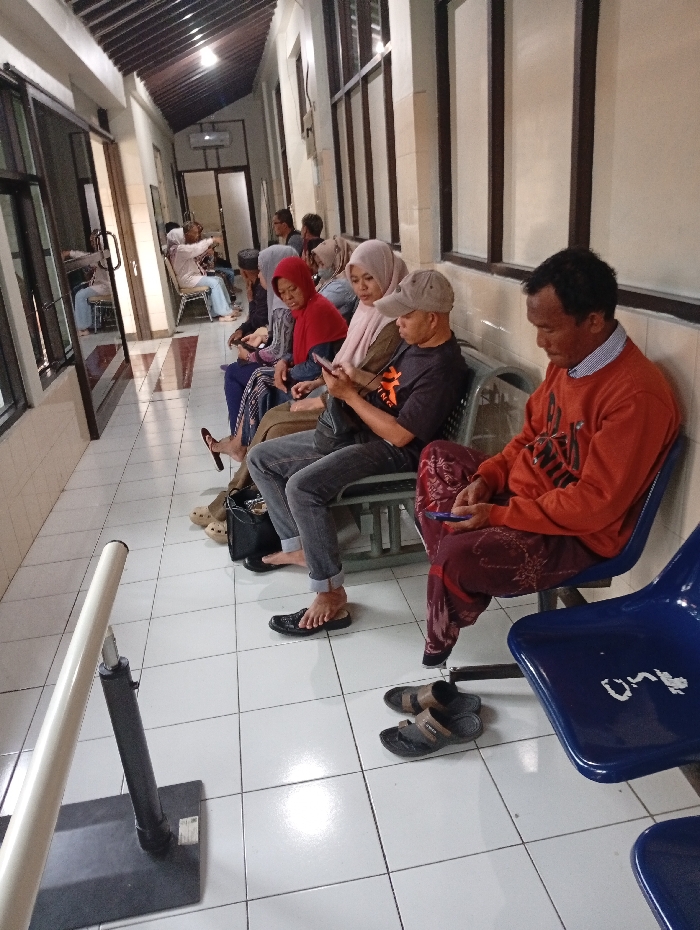A group of people sit in a tiled hallway, seemingly waiting. Most are focused on their phones. The individuals wear casual clothing, including headscarves and a baseball cap. A row of windows runs along the wall behind them. Extra pairs of sandals sit on the floor by the chairs. The hallway is brightly lit. A pole attached to a base stands on the left of the frame. In the background, more people are seated further down the hall.
