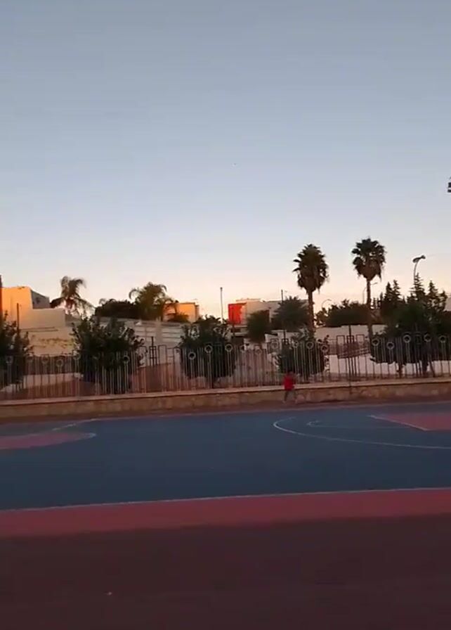 n outdoor basketball court with several people on it. The court is painted blue and red, and has white lines marking the boundaries and key areas. There is a basketball hoop at one end of the court. Several palm trees and other trees are visible behind the court. A white building with a red flag flying on top is also visible in the background. The sky is light blue, suggesting it is either early morning or late afternoon. Several people, mostly young men, are on the court. Some are standing around the hoop, while one person wearing a red shirt is near the sideline.