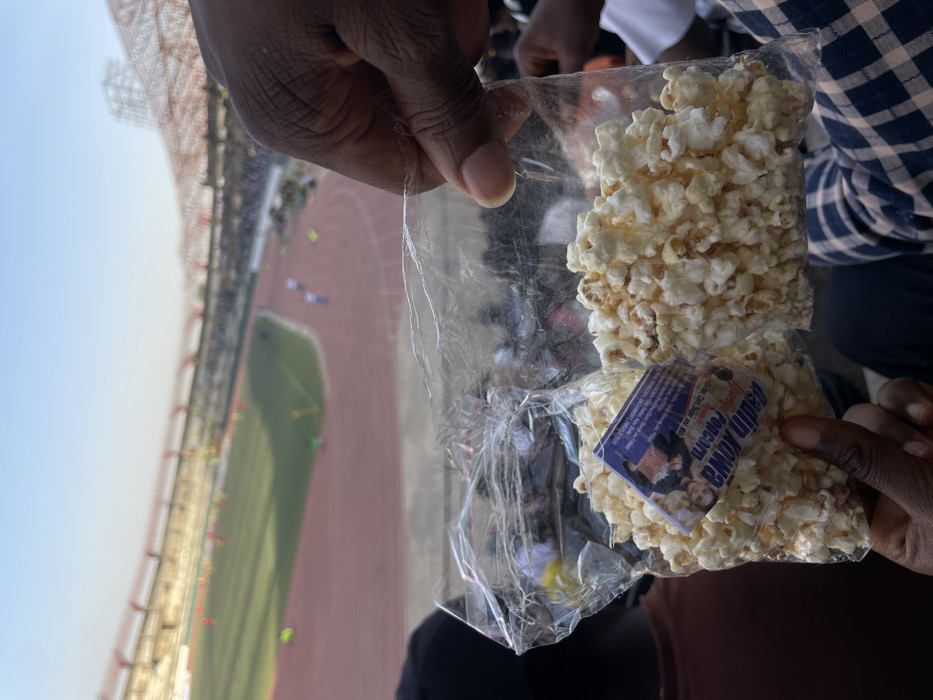 - "A first-person perspective photograph captured from the stands of a stadium at New Stadium, Nigeria, depicts two transparent plastic bags filled with popcorn held by a person's hands in the foreground" by FM-rAPpL2, licensed under CC BY 4.0