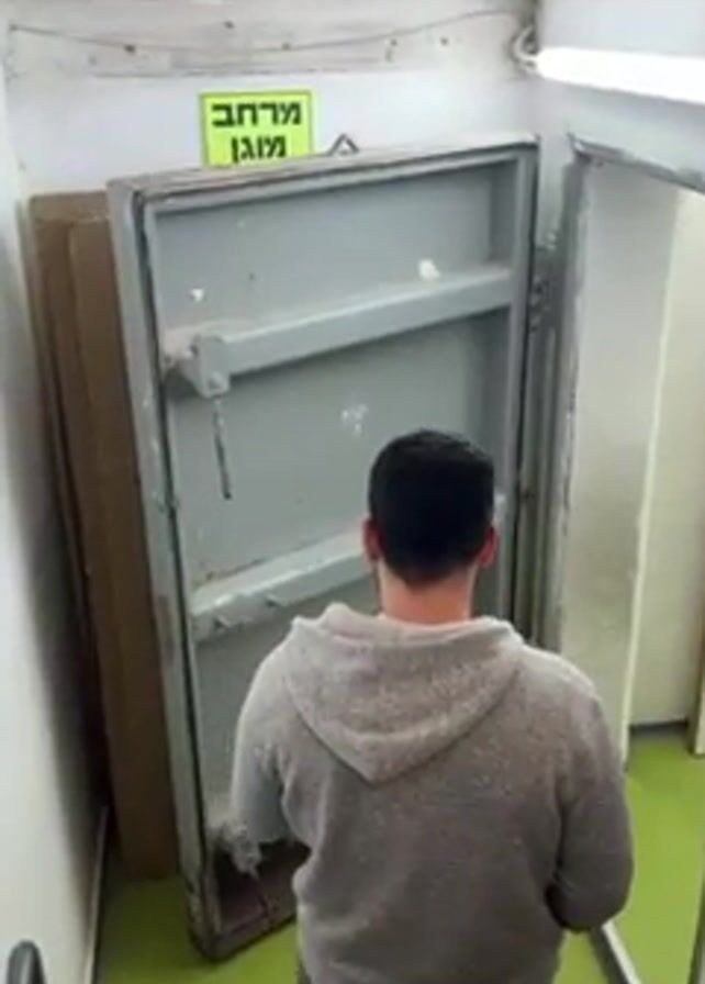 A person in a gray hoodie walks towards a gray metal door labeled in Hebrew and opens it