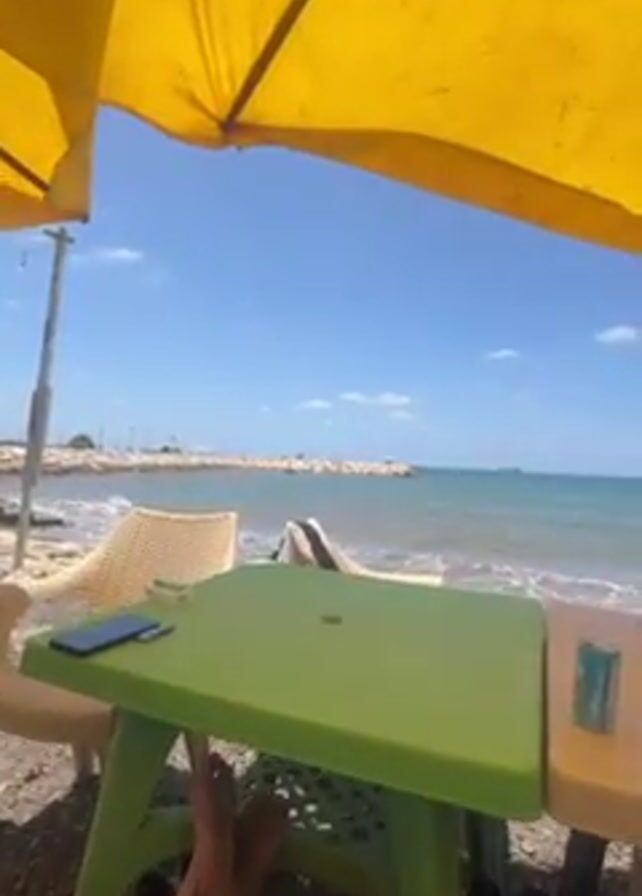 person sitting under a yellow beach umbrella at a table near a sandy beach, on a sunny day. The view extends to the sea, with a breakwater visible in the distance. The person's legs and feet are visible under the table. There is a cell phone, a pack of cigarettes, and other items on the table. Beach chairs are visible next to the table. The waves can be heard in the background, along with music.