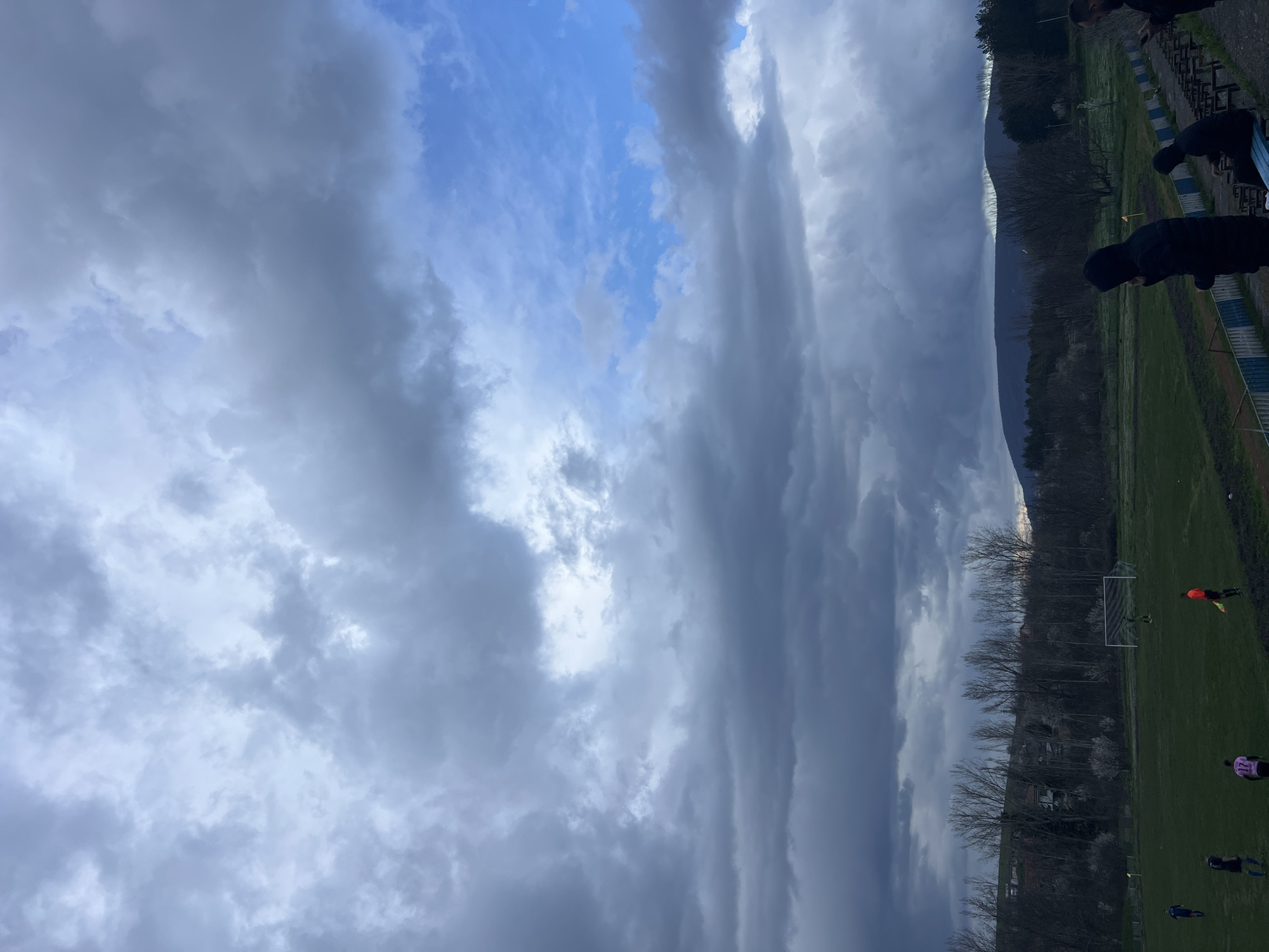 The image depicts an outdoor football pitch and spectator stand in Smyadovo, Bulgaria, under an overcast sky with patches of blue. In the foreground on the right, a multi-tiered spectator stand with empty blue and white benches is visible. Three individuals stand or sit on the higher level of this stand, mostly silhouetted; two wear dark hooded garments, and one is partially visible holding a phone. The midground features a green grass football pitch. Several individuals are on the pitch: a player in a pink jersey with number 17, another in a dark jersey, and one in a blue jersey. A player in a green goalkeeper jersey is positioned near a white goalpost with a net at the far end of the pitch. A linesman in an orange jersey holds a yellow flag on the right side of the field. The background consists of a line of predominantly bare deciduous trees, some displaying white blossoms, separating the pitch from distant residential buildings and forested hills or mountains. The sky above is dominated by dark grey clouds, with a segment of clearer blue sky visible in the upper right quadrant. The overall lighting suggests late afternoon or early evening.