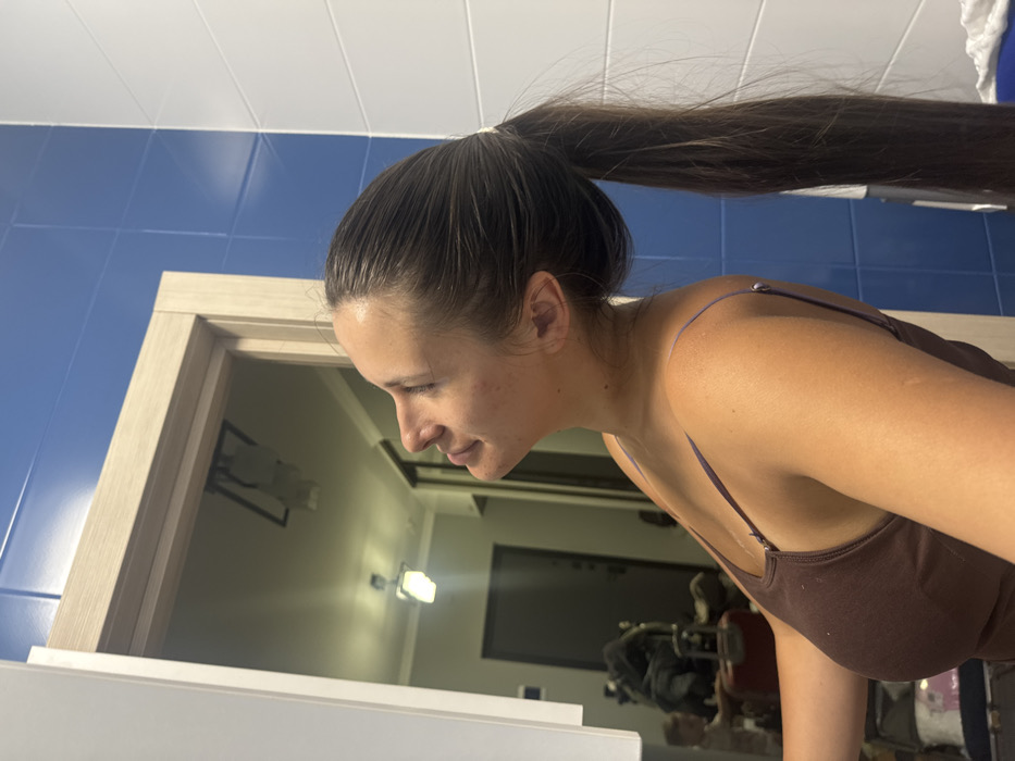 A woman with medium-brown hair tied in a high ponytail is captured in a domestic setting within Odintsovo, Russia