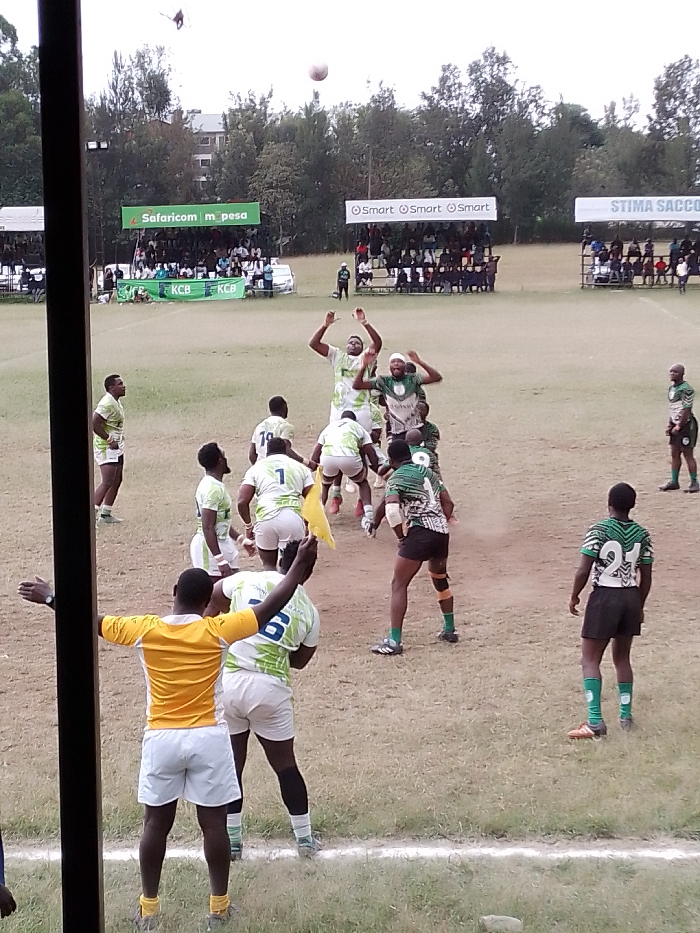 The image depicts an outdoor rugby match at a sports ground in Nakuru, Kenya
