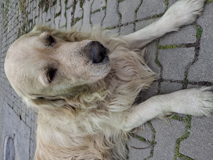 - "A light-blonde Golden Retriever dog is resting on a paved surface in Stara Zagora, Bulgaria" by FM-OiT0x1, licensed under CC BY 4.0