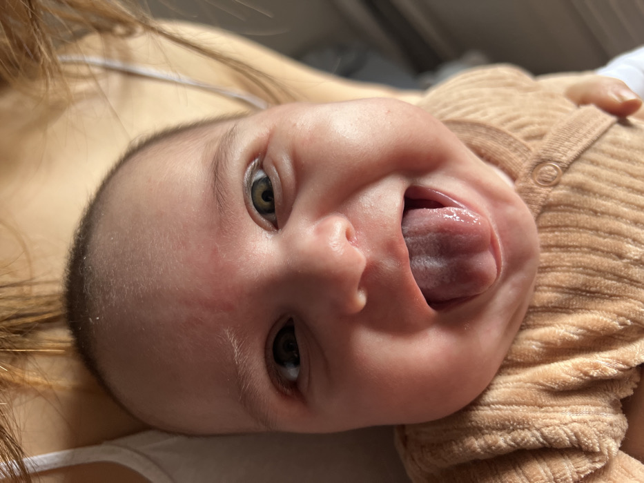 A close-up, eye-level portrait of an infant is depicted, set indoors in Frankfurt, Germany. The subject is an infant with fair skin, dark irises, and sparse, fine dark hair. The baby's mouth is open, and a moist tongue is fully extended, revealing central vascular structures. The expression is animated, with wide eyes and a playful demeanor. The infant wears a light brown, ribbed, wrap-style top, secured by a single fabric-covered button on its right side. Partial visual evidence of an adult holder includes a white garment strap on the upper left and long, reddish-brown hair visible above and to the right of the infant's head. Illumination is provided by a soft, warm light source, primarily from the front. The background is uniformly out of focus, offering no specific environmental identifiers beyond an indoor setting.