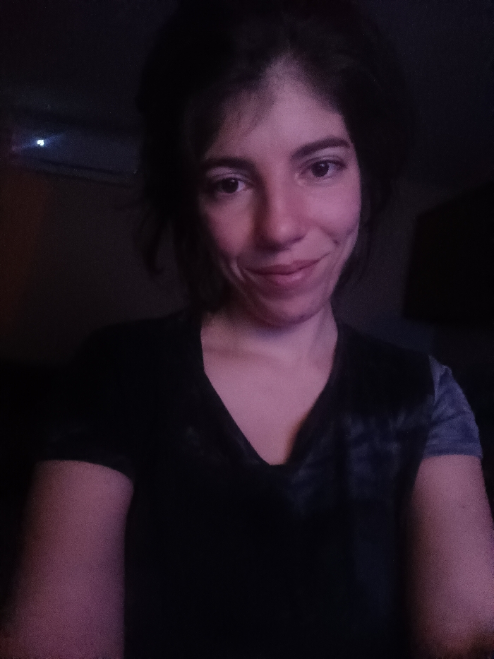 A single female individual is depicted in a chest-up portrait within a dimly lit indoor setting. The subject has short, dark hair and a fair complexion, with her face being the primary illuminated area. She is wearing a dark, V-neck t-shirt, exhibiting a subtle texture on the torso and a contrasting grey fabric on the visible portion of her left sleeve. Her gaze is directed straight ahead, and a slight upturn is visible at the corners of her mouth. In the upper left background, a distinct blue-white indicator light emanates from a wall-mounted electronic unit. The surrounding environment is otherwise unidentifiable due to low illumination. Visual evidence within the image does not provide sufficient detail to ascertain the specific geographic location within Byala Slatina, Bulgaria.