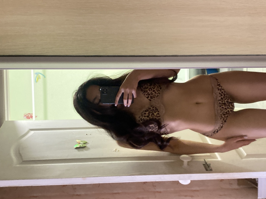 The scene is an indoor residential setting in Izhevsk, Russia. A person, appearing female, with long, dark, wavy hair, stands facing a full-length mirror. The individual is wearing a two-piece leopard print bra with light lace trim and matching briefs, also with lace trim. Their face is obscured by a dark-colored smartphone, held in the right hand, angled to capture the reflection in the mirror. The individual's left hand rests lightly on their left thigh. To the left of the reflected person, a white panel door is visible, featuring a white circular door handle and a green butterfly-shaped decorative item. Beyond the open doorway reflected in the mirror, a room with light green walls is discernible, showing a white horizontal shelf or rail with indistinct red and yellow objects positioned above it. To the right of the reflected person, a vertical section of a light wooden or laminate panel is visible.