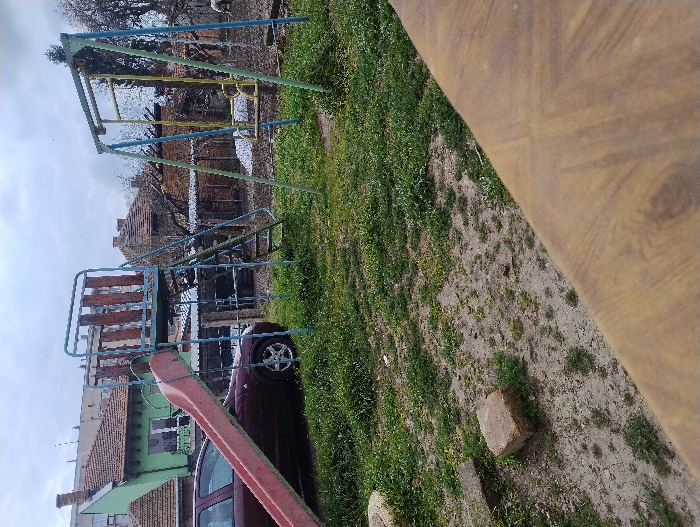 The image displays an outdoor scene in Lom, Bulgaria, under an overcast sky. In the immediate foreground, a light brown wooden surface, likely a tabletop or bench, occupies the lower right quadrant. The ground throughout the scene is a mix of sparse green grass and bare dirt, featuring a large, round, light-colored concrete object on the left and a rectangular concrete or brick block centrally located in the mid-foreground. Two pieces of weathered playground equipment are prominent in the mid-ground: a red plastic slide with a blue metal support structure, a wooden top platform, and a ladder, positioned on the left; and a blue and yellow metal swingset, featuring two swings, situated to the right. A dark red hatchback car is parked on the grass, partially obscured by the slide, with its front driver's side wheel and fender visible. In the background, a two-story building with a light green facade, reddish-brown tiled roof, and a visible brick chimney is located to the left. To its right, multiple older, brick structures with similar tiled roofs are present, some appearing to be in disrepair or featuring exposed wooden elements. A small pile of white material lies on the ground behind the swingset. Further back, mature trees with bare branches are visible, along with indistinct taller buildings against the cloudy sky. No individuals are present in the scene.