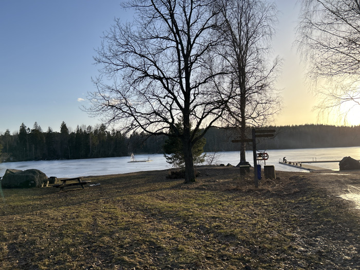 The scene depicts an outdoor recreation area in the city of Fjällnora, Sweden, under a clear, late afternoon sky with low sun exposure on the right horizon. The foreground consists of dry, sparse brown grass and bare earth. To the left, two large, dark grey boulders sit near a wooden picnic table with attached benches. Centrally, a wooden signpost with multiple blank directional signs is present, alongside a blue rectangular waste bin and a cylindrical brown bin. A dirt path leads toward the water on the right. The midground is dominated by a large body of water, predominantly covered in white ice. A wooden dock extends into this ice-covered surface from the right shore. At the end of the dock, a single individual in dark clothing is seated. In the left-central portion of the frozen water, a small, light-colored floating platform is visible. The background features a dense treeline, comprising both deciduous and coniferous species, marking the opposite shore. Several tall, bare deciduous trees with complex branch structures are prominent in the midground, partially obscuring the distant treeline. The sky transitions from light blue to a golden hue on the right.