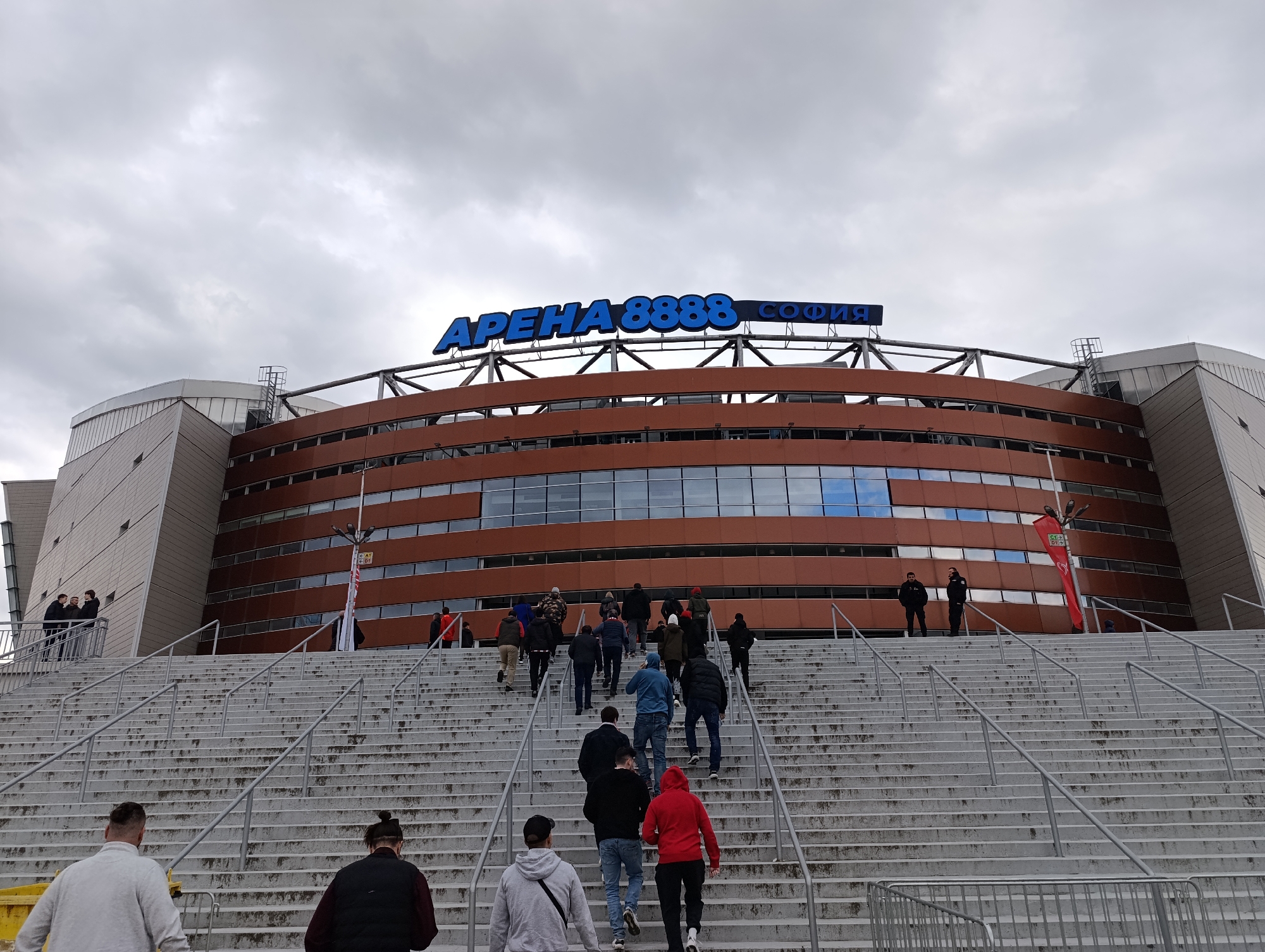 "Arena 8888 Sofia" in Sofia, Bulgaria. People are walking up a large set of concrete stairs towards the entrance of the arena. The building has a curved facade with horizontal windows. The sky is overcast with grey clouds. The sign "Arena 8888 Sofia" is prominently displayed in blue letters on the top of the arena. Some individuals are standing or walking around the top of the stairs and near the arena entrance.