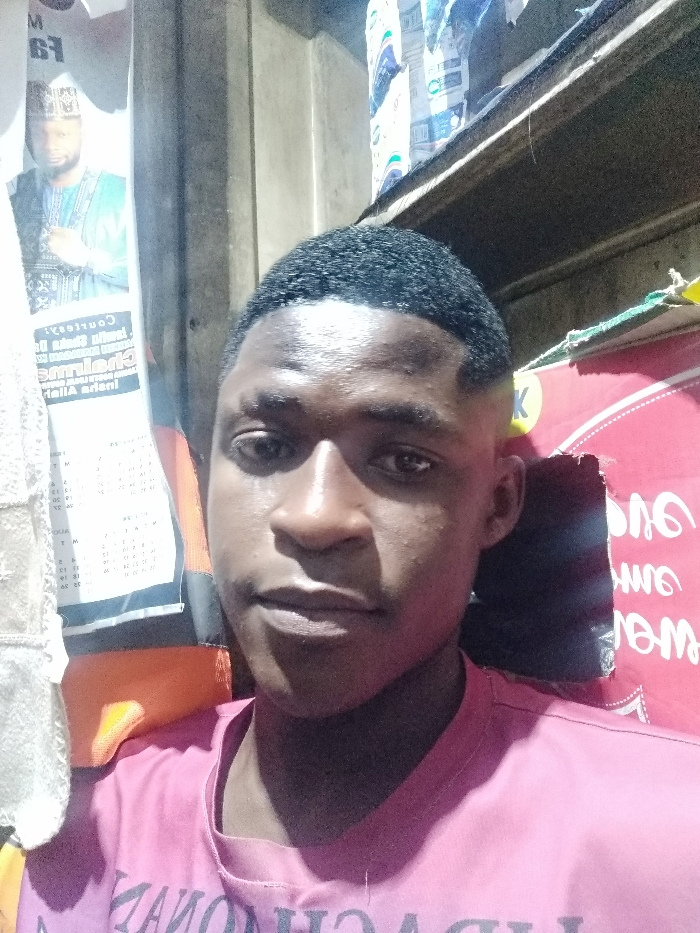 A direct-facing portrait depicts a young Black male, approximately late teens to early twenties, with dark, short, faded hair and a neutral expression. He is wearing a pink short-sleeved t-shirt with faint text visible on the lower front. The setting appears to be an indoor or semi-sheltered commercial or public space in Maiburiji, Nigeria, characterized by a cluttered background. To the subject's left, a vertical poster is displayed, featuring an older Black male with a beard, wearing a traditional embroidered cap and a light-colored robe. Below this image, partially obscured text in English includes "Courtesy?" and what resembles a date or calendar list. An orange fabric or material is visible behind this poster. To the subject's right, a red surface with white, illegible script is present, accompanied by a small yellow circular sticker bearing a black 'K'. Above this, various faded and weathered posters or advertisements with blue, white, and green patterns are visible, mounted on a dark, unidentifiable structural element. The lighting is frontal and somewhat uneven, casting a sheen on the subject's forehead.