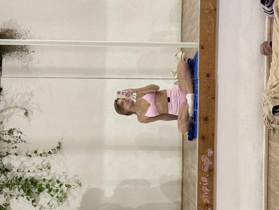 This image depicts an interior scene within a studio in Anzio, Italy, identifiable by "STUDIO" marked on the mirror frame. The primary subject is a female, visible in reflection within a large mirror, seated cross-legged on a blue towel placed on a light wooden floor. She possesses light brown, shoulder-length hair and wears a pink two-piece athletic ensemble consisting of a halter-neck top and high-waisted shorts, paired with white socks. She holds a white smartphone, equipped with a decorative case, in her right hand, pointed towards the mirror to capture her reflection. The background, observed through the mirror's reflection, features a plain white wall adorned with green, leafy vines descending from its upper section. An electrical outlet is visible on this wall. A slender, vertical white pole stands to the right of the subject's reflection. In the foreground, below the mirror's edge, a crumpled light brown towel, a small reddish knitted object, and a pair of striped foot coverings lie on the wooden floor.