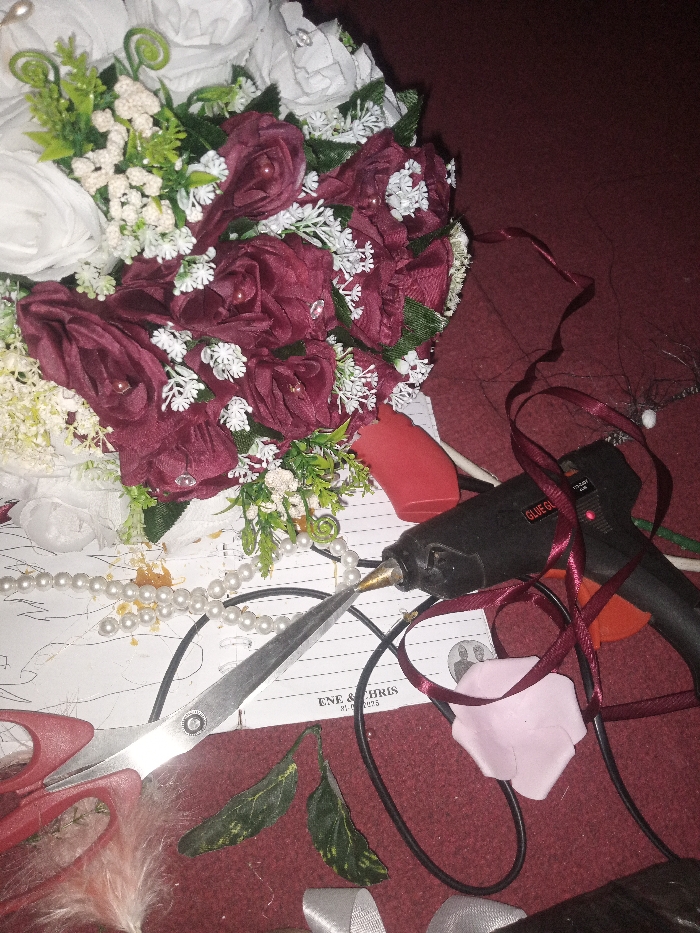 A close-up, overhead view depicts a collection of crafting materials and a partial floral arrangement resting on a dark red, possibly fabric, surface. The primary subject is a large artificial floral arrangement, containing both white and dark red (burgundy) fabric roses, interspersed with small white filler flowers and green artificial foliage. Some burgundy roses feature small clear beads or faux crystals. Below the floral arrangement, a hot glue gun (black, branded "GLUE GUN 1000H") with a metal nozzle points leftward. A red protective cap is near its base. Adjacent to the glue gun are tangled dark red ribbons, a light pink artificial rose petal, and a thin black coiled wire with a small white bead. To the left of the glue gun, silver-colored scissors with red plastic handles are open, resting on a white sheet of paper. This paper displays black text, including "ENE & CHRIS" and "21.05.2025," along with faint line drawings and two small circular images or silhouettes. A string of off-white faux pearls is draped across the paper and other items. Two detached green artificial leaves with visible veins are positioned near the bottom center. Light-colored feathers are partially visible at the bottom left. The scene is located in Unknown, Unknown.