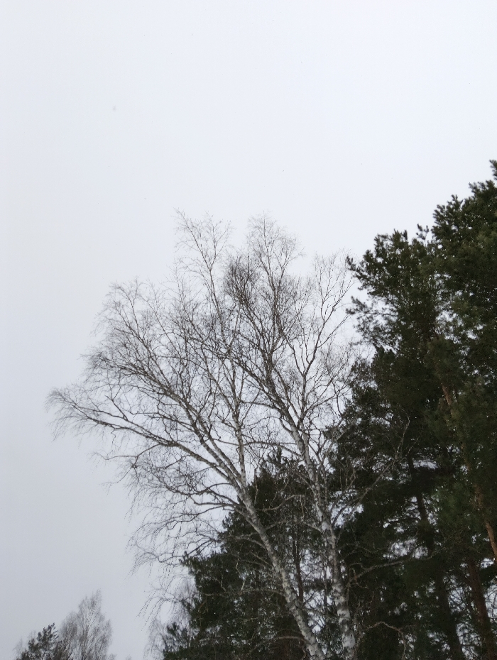 The scene depicts a natural environment under an overcast sky, observed looking upwards into a tree canopy in the city of Красный Маяк, Russia. The upper portion of the frame is dominated by a light grey, featureless sky. A large, deciduous birch tree with white, peeling bark and numerous bare, fine branches is prominently positioned in the left-center of the image, extending upwards. To the right and partially behind the birch tree, a dense cluster of dark green evergreen trees, likely conifers, is visible. Smaller, bare tree branches are also discernible in the lower-left foreground. The bare branches of the birch tree suggest either a winter or early spring season. No human figures or man-made structures are visible.
