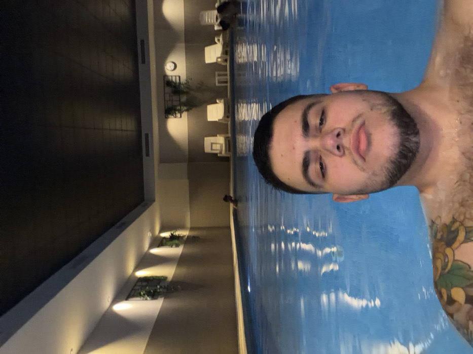 The image displays an indoor swimming pool setting located in Villajoyosa/la Vila Joiosa, Spain. In the foreground, a male individual with short dark hair, a beard, and a visible multi-colored tattoo on his left shoulder is submerged in clear blue water, looking directly forward. In the mid-ground, two other individuals are partially visible within the pool water: one to the left and another further back on the right. The pool area walls are two-toned, featuring a lighter upper section and a darker lower section, illuminated by recessed wall lights. Decorative elements include wall-mounted planters with greenery and a large plant arrangement with a wall clock on the right side. Several white lounge chairs and small side tables are arranged around the perimeter of the pool. The ceiling is dark and textured, with visible air vents along the wall junction.