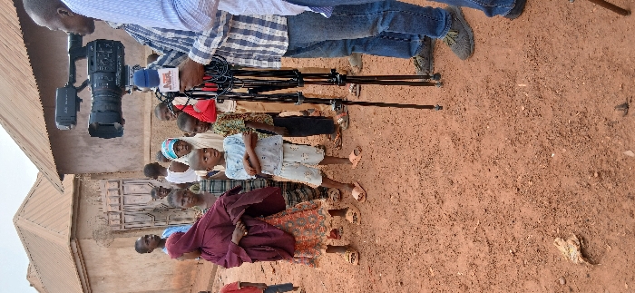 An outdoor scene in Rigasa, Nigeria, depicts media personnel filming a group of children on unpaved reddish-brown ground