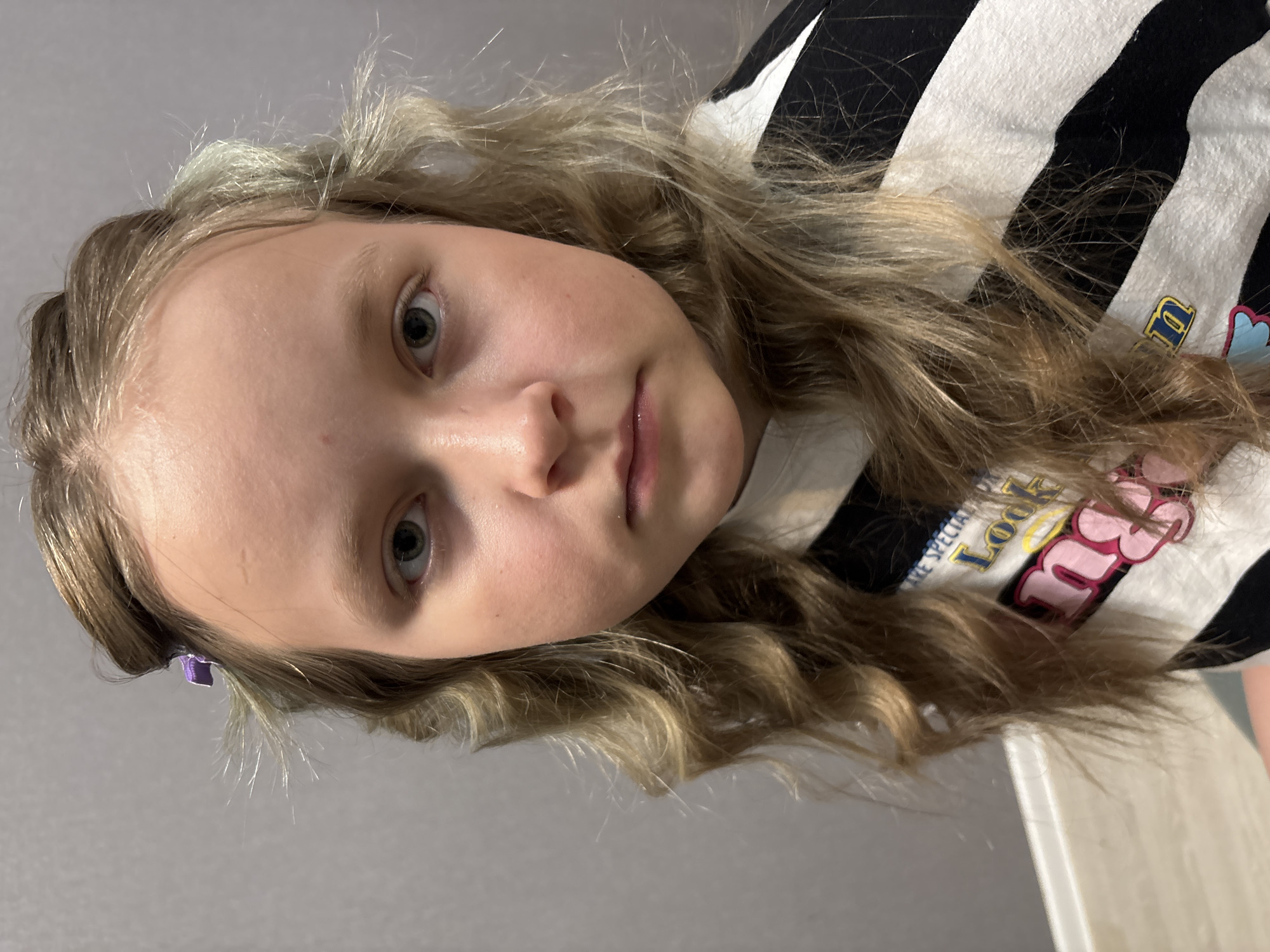 A young, fair-skinned individual with wavy, light-brown hair is featured in a close-up, slightly angled portrait. A small purple hair clip is visible near the top of their head on the left side of the frame. The person is wearing a black and white striped top with a graphic design on the chest. The background consists of a plain gray wall and a glimpse of a white surface. There is no indication of this image being taken in Izhevsk, Russia.