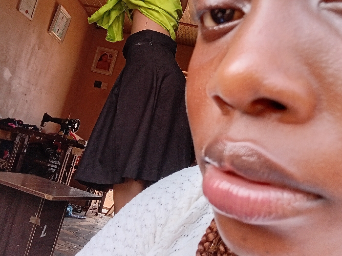 An indoor scene features a close-up of a dark-skinned individual in the foreground, showing the right eye, nose, and glossy lips. This individual wears a white textured garment and has visible brown braided hair. In the mid-ground, a second individual stands partially visible from the mid-torso down, wearing a vibrant light green top/scarf and a dark, pleated skirt. The background walls are a muted orange-brown and appear aged, displaying two framed white certificates and one framed photograph. A vintage black sewing machine is present on a wooden table to the left, with fabrics or items stacked below it. A dark wooden cabinet is partially visible in the lower-left foreground. The flooring is dark. The environment suggests a functional space, possibly a tailoring workshop. The specific location within Lagos, Nigeria, cannot be determined from the visual data.