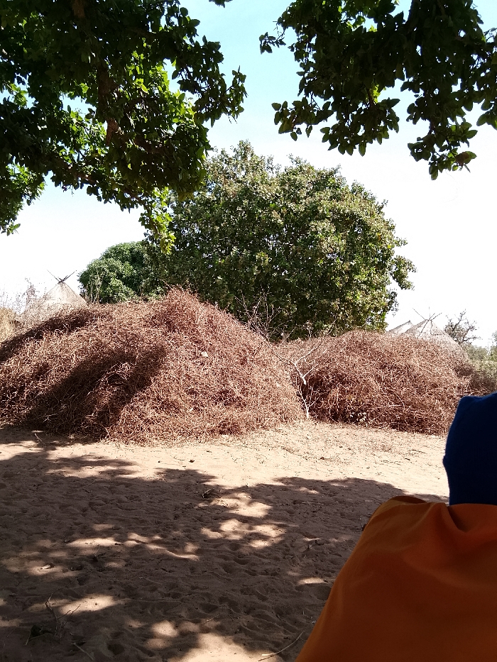 This image is located in Shendam, Nigeria, depicting an outdoor scene under a clear sky. In the lower right foreground, the back of a person is partially visible, wearing a blue head covering and an orange garment, positioned in an area of dappled shadow. The ground is sandy, light brown, with varied textures created by sunlight and tree shadows. The midground is dominated by two large, irregularly shaped mounds composed of dense, dried, reddish-brown brushwood or thorny vegetation. A bare, lighter-colored branch protrudes between the two piles. Behind these mounds, multiple trees with vibrant green foliage are present, including a large, full tree centrally located in the background. Portions of at least two structures with conical thatched roofs, consistent with traditional huts or granaries, are visible in the background, partially obscured by the brushwood piles, one on the left and another towards the right. The upper portion of the frame reveals a clear, light blue sky, with the canopy of a large, green-leafed tree framing the top and upper-left corner of the image. No discernible actions or interactions are depicted.