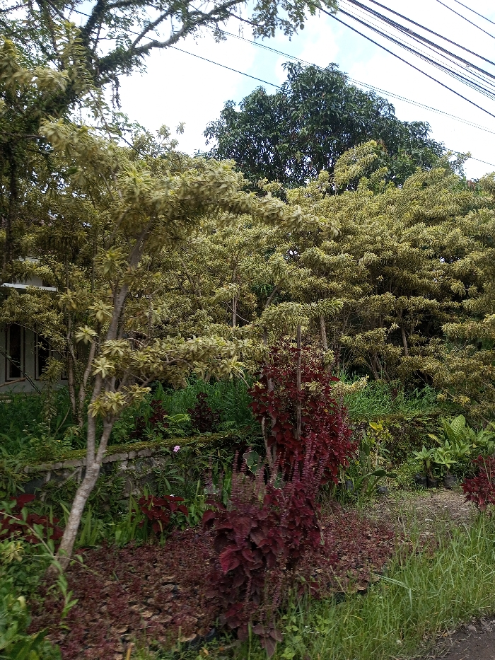 The image displays a densely vegetated outdoor scene in Cibodas, Indonesia. The upper portion of the frame features a bright, overcast sky traversed by multiple parallel black electrical or communication lines. Below these lines, a large, dark green tree stands prominently, partially obscured by numerous lighter green and yellowish-green trees or large shrubs that dominate the mid-ground with their variegated foliage. In the lower half of the image, the foreground is rich with diverse plant life. Clusters of maroon-leafed plants, possibly Coleus, with some showing vertical flower spikes, are prominent, particularly on the right side. These are interspersed with various green ground cover plants, grasses, and patches of darker earth. A low, grey stone retaining wall or foundation is visible on the left, supporting additional vegetation. A small pink flower blooms on this wall. To the far left, behind the lighter trees, a portion of a light-colored building, including a dark window frame, is visible. The ground on the far right shows tall green grasses bordering a patch of earth, with several small black plastic plant bags visible further back. No people or animals are present.