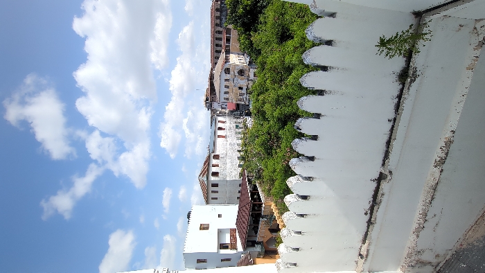 This image presents an elevated, static view of a segment of Stone Town, Zanzibar City, Tanzania, under a partly cloudy sky. The foreground is dominated by a weathered white masonry wall with a crenellated top, featuring multiple battlements and embrasures. This wall exhibits areas of chipped paint, dark stains, and concrete erosion, with a small green plant growing from a crevice on the right side. Beyond the foreground wall, a dense, verdant canopy of broadleaf trees occupies the midground, partially obscuring ground-level structures. Above and interspersed with the trees, various multi-story buildings are visible. These structures predominantly feature light-colored, weathered facades, ranging from clean white to stained off-white. Architectural details include small, rectangular windows, many with dark frames or shutters. A prominent white building on the far left possesses a flat roof and a small balcony with a reddish-brown railing. Below it, an open-sided structure with a dark, possibly corrugated or tiled, roof is visible through the trees. Towards the center and right, older, more dilapidated buildings with traditional sloped roofs (some tiled, some corrugated metal) and numerous small, dark openings are observed. The background reveals further urban development, appearing denser and less distinct. The sky, occupying the upper third of the image, is bright blue with scattered, fluffy cumulus clouds, indicating daylight conditions. No individuals or specific activities are depicted.