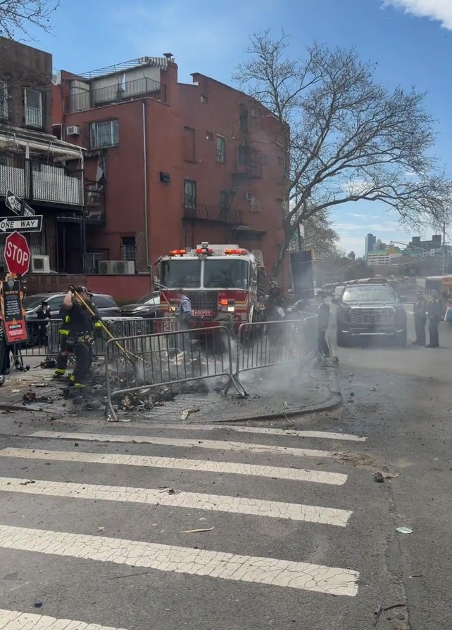 street scene after a fire. Debris litters the road, enclosed by metal barriers. Smoke rises from the area, obscuring some details. Firefighters in gear mill around the scene, with a fire truck parked nearby, its lights flashing. The backdrop includes a red brick building, adding a stark contrast to the chaotic aftermath.