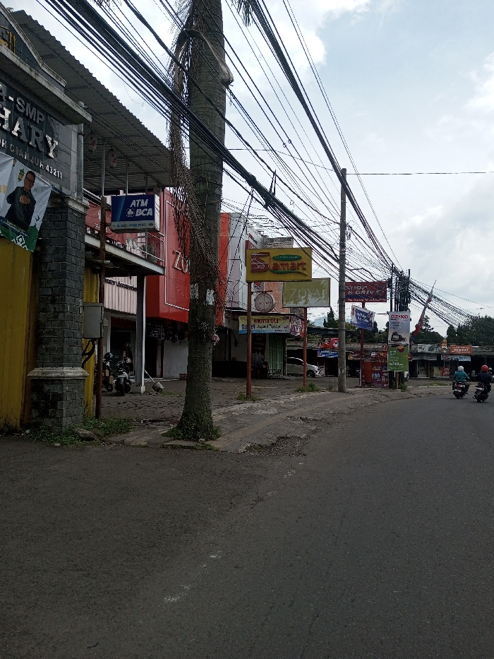 An urban street scene is depicted under an overcast sky, looking down an asphalt road that curves slightly to the right in the mid-ground. The foreground consists of dark asphalt and a worn concrete sidewalk on the left. On the left side of the frame, a multi-story entrance structure is visible, featuring a yellow wall and grey stone pillars. A white banner attached to the left pillar displays a man in a suit and partial text including "A-SMP HARAPANARY" and "CIANJUR 43211". Behind this entrance, a red building has an "ATM BCA" sign on its upper level. Below, an open area shows at least three parked motorbikes and a broom leaning against a wall. In the center, a tall palm tree with a rough, fibrous trunk grows from a narrow concrete median. This tree and numerous utility poles are heavily laden with a dense, complex network of black electrical and communication wires that crisscross overhead against the cloudy sky. Behind the palm tree, commercial buildings display various signs, notably a yellow and orange "I-SMART" sign and an orange "ZOYA" sign. On the right side of the road, two individuals on motorcycles, both wearing helmets, are riding away from the viewer. The lead motorcycle is light blue, followed by a dark-colored one. The street continues past additional commercial buildings with signs like "SHOP & DRIVE" and "EZ-KO". Further utility poles with bundled wires are present. Distant green foliage is visible on the horizon, behind the urban structures. The environment suggests an active commercial thoroughfare.