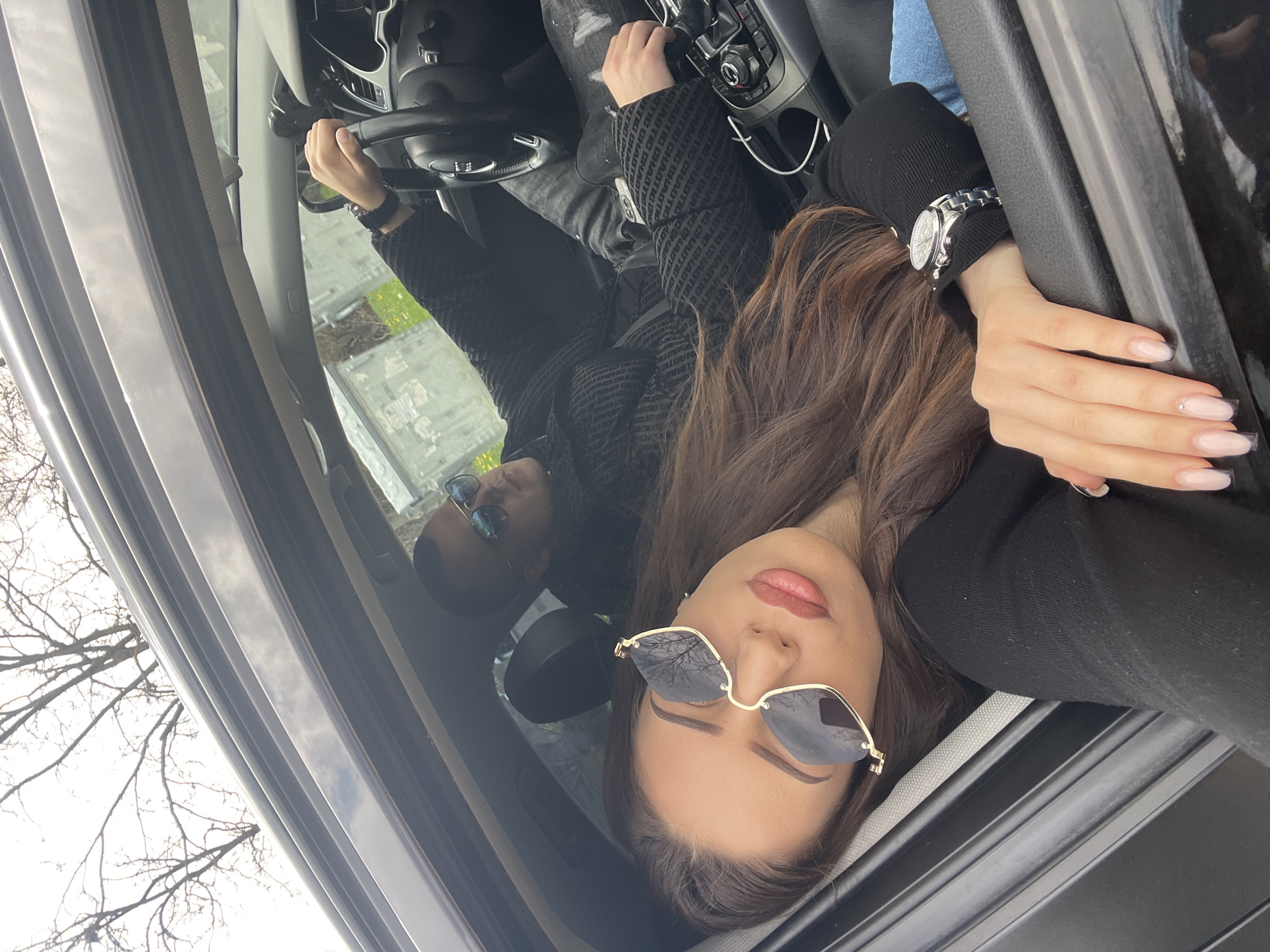 This image shows two people inside a car. The car appears to be parked, based on the tree branches visible through the open roof. The individual closest to the camera is a woman wearing sunglasses, a black top, and a watch on her left wrist. Her hand rests on the car's interior. Behind her, partially visible, is a man also wearing sunglasses and a black jacket. He is holding the steering wheel. The background suggests an outdoor setting, possibly in a residential area. There is no evidence to suggest that the image was taken in Pchelishte, Bulgaria.