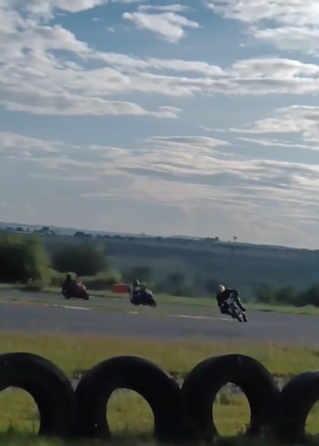Two motorcycles race on an asphalt track under a sky of patchy clouds