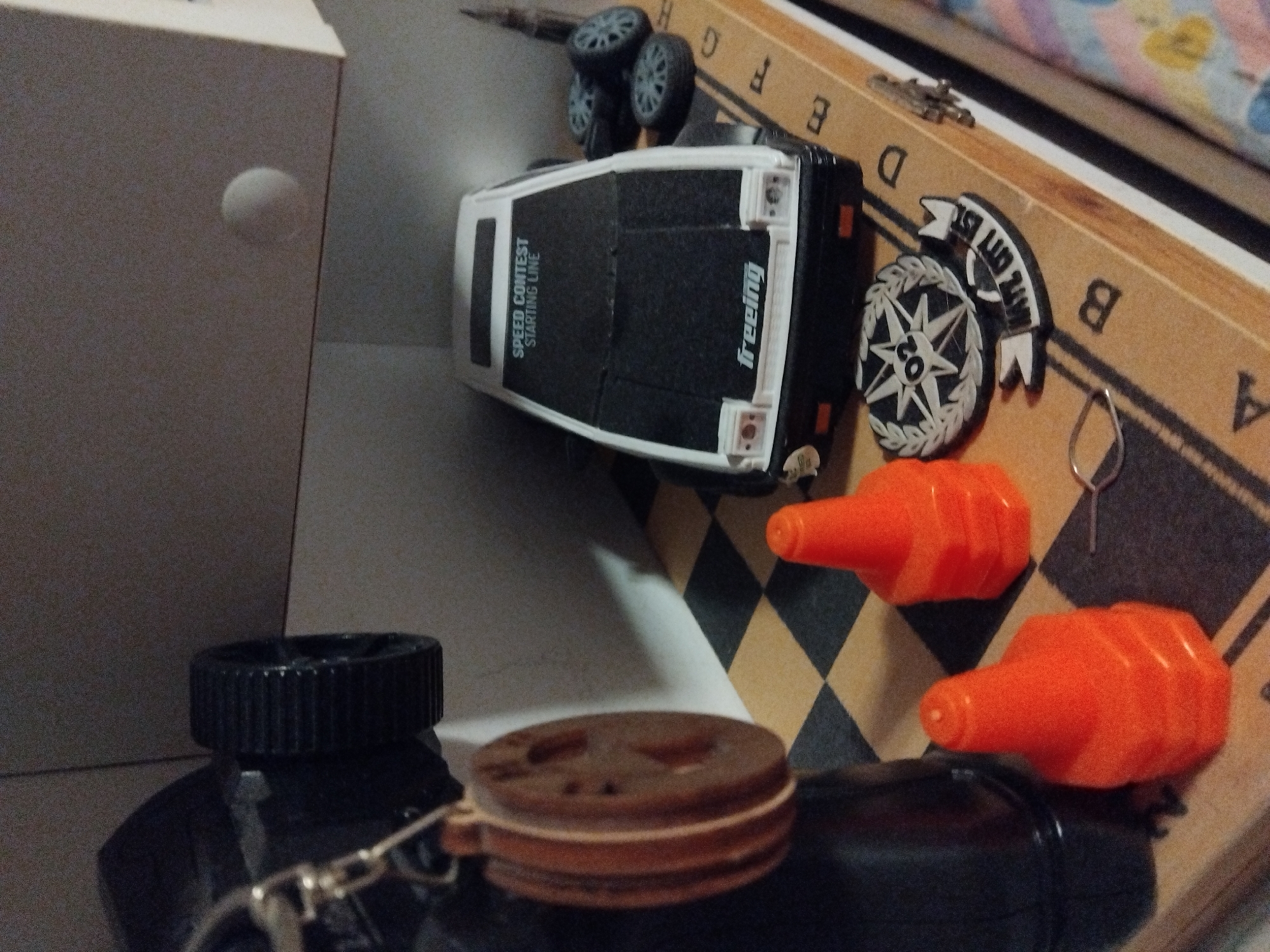 collection of objects on what appears to be a patterned surface, possibly a box or a board with a diamond-shaped pattern. To the left, a white box with a round indentation is partially visible. In the center, there is a black and white toy car, lying upside down. Scattered around it are toy car wheels, two orange plastic objects, and what appears to be a silver metal teardrop-shaped loop. The background contains a wooden surface with letters printed on it. The focus is on the toys and the textured surface, with the other details providing context to the overall scene. There is no evidence to place the image in Nova Zagora, Bulgaria, or to identify any people, actions or interactions.