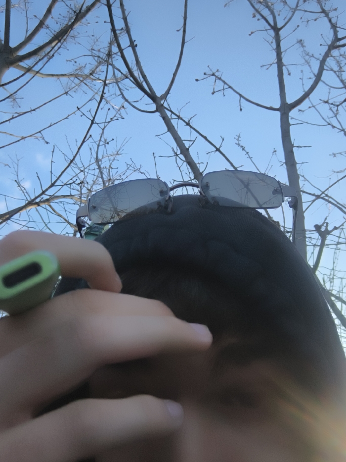The image depicts an outdoor scene in Sofia, Bulgaria, under a clear blue sky with numerous bare deciduous tree branches extending across the upper frame. The lower portion reveals the upper head of an individual wearing a dark-colored hooded garment. Silver-framed sunglasses with reflective lenses are resting on top of the subject's head, reflecting the overhead branches. A hand, positioned in the immediate foreground, partially obstructs the subject's face. This hand holds a light green, elongated object with a black, rectangular opening at its visible end. Direct sunlight is present, creating a lens flare in the lower right quadrant.