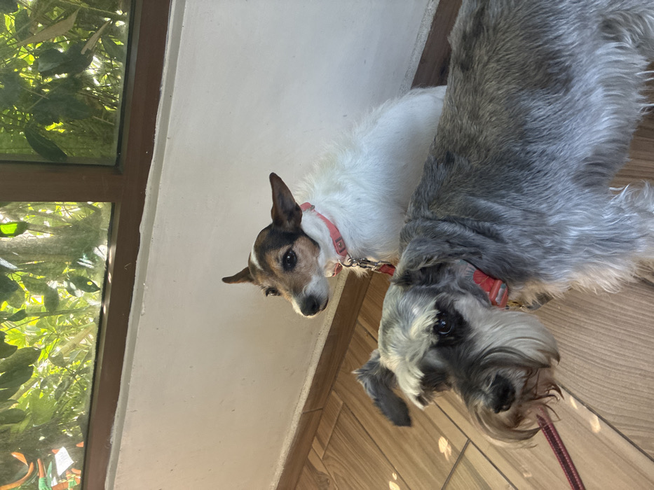 - "Two dogs, a Jack Russell terrier mix and a miniature schnauzer, stand together indoors" by FM-5mNCn2, licensed under CC BY 4.0