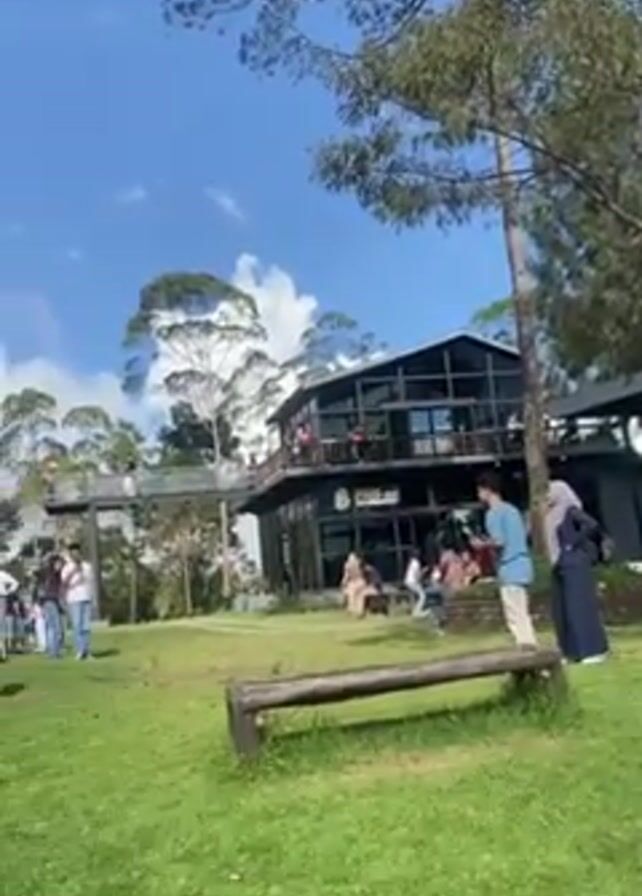 Here's a description of the scene: The video shows an outdoor area, possibly a park or recreational space, adjacent to a two-story building with large windows, resembling a cafe or restaurant. The building is surrounded by trees and a grassy area with benches. People are visible both inside the building and on the grounds. A skybridge connects the building to the surrounding trees. The camera pans across the landscape to show people resting on the grass, and further reveals a lush, tree-covered hill. In the distance, a mountain peak is visible against a blue sky with scattered clouds.