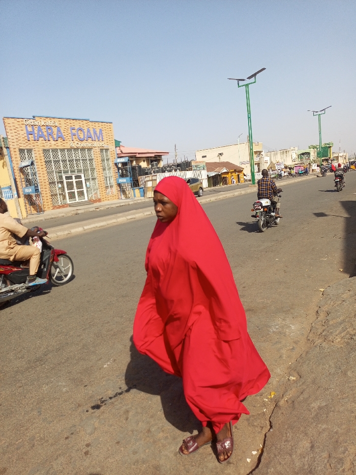 This image captures a street scene in Pantame, Nigeria, on a clear day. In the foreground, a woman walks along the right side of a paved road. She is dressed in a full-length, flowing red garment covering her head and body, and wears metallic-toned sandals. Her shadow is cast on the asphalt to her right. To the left and slightly behind the woman, a man in light-colored attire is partially visible, riding a red motorcycle traveling in the same general direction. Further left, a prominent two-story building features a brown brick-patterned facade and "Gidan Kadira HARA FOAM & Chemical Ltd" signage in large yellow letters. This building has multiple windows and a white double door entrance. In the midground, the road continues, occupied by several motorcycles. One individual in a plaid shirt rides a white motorcycle away from the camera. Another motorcycle is visible further down the road on the right. Green streetlights with solar panel attachments line the street. The background features various commercial structures, including one with stacks of tires visible outside. The sky is bright and clear.