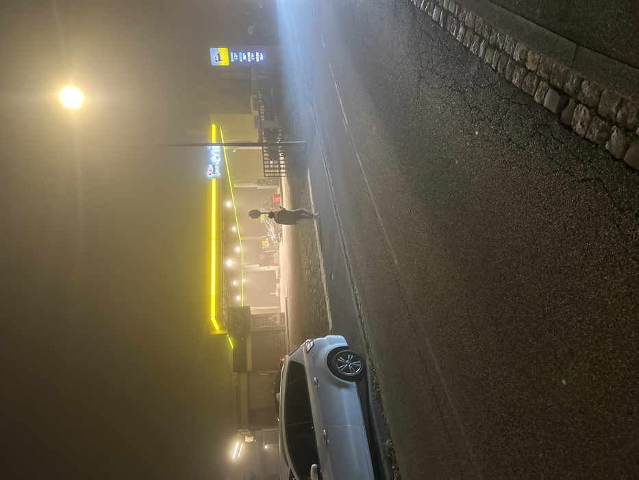 The image presents an exterior nighttime scene at an Eni gas station in Strasbourg, France, under conditions of dense fog. The gas station's prominent feature is a bright yellow canopy, internally illuminated, displaying the blue and yellow "eni" logo. Beneath the canopy, fuel pumps are visible. To the right of the station's main structure, a tall vertical sign displays fuel prices in Euros, such as Gazole at 1.639 €/L and SP98 at 1.799 €/L. A building with a dark facade or partially lowered security shutter is situated to the left under the canopy, adjacent to a car wash bay structure. In the mid-ground, a single individual is walking on a paved pathway, moving towards the gas station. This person, appearing to be an adult in dark attire, holds a dark, circular object above their head with their right hand. To the left, a light-colored crossover SUV or hatchback is parked partially on the paved shoulder, facing away from the camera. The immediate foreground features an asphalt road surface exhibiting wear and cracks, bordered by a cobblestone curb on the right. A tall metal streetlight pole is positioned on the right side of the road, emitting a bright yellow-orange light that is heavily diffused by the pervasive fog, creating a distinct halo effect around all light sources and significantly reducing visibility across the scene. A dark metal fence or barrier is present between the gas station property and the sidewalk on the right.
