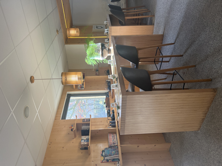 This is an interior view of a contemporary restaurant or tea house located in Villeneuve-d'Ascq, France. The scene depicts an unoccupied dining area characterized by a modern, minimalist design with a predominant use of light-colored wood. In the foreground and extending towards the background are two light wood, high-top communal tables or bars. The table in the foreground seats at least four individuals, with four dark gray upholstered bar stools with light wood legs and black metal footrests positioned around it. The table surface is set with multiple clear drinking glasses, small white bowls, and green spoon-like utensils. The walls are largely covered in light wood paneling, featuring integrated shelving units on the left side and beneath the window. These shelves display various objects, including books (some appearing to be manga), small decorative items, and a collection of black teapots and cups. A large rectangular window on the left wall offers a view of outdoor foliage with autumnal colors. Above the tables, two cylindrical pendant lights with wooden slat shades emit a warm, artificial light. The ceiling is a white grid tile ceiling, typical of commercial spaces, with recessed circular lights and speakers. On the back high-top table, a large, clear glass terrarium or vase containing vibrant green fern-like plants serves as a centerpiece. Additional place settings are visible on this table. The flooring is a dark gray speckled carpet or similar material. Natural light enters through the window, casting shadows on the floor. No individuals are present in the scene.
