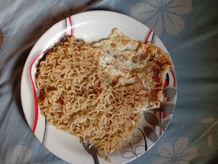 A white plate with red and gray accents holds a portion of cooked noodles. A fried egg rests on top of the noodles, partially covering them. A metal fork is visible beneath the noodles. The plate sits on a blue surface patterned with white floral designs.