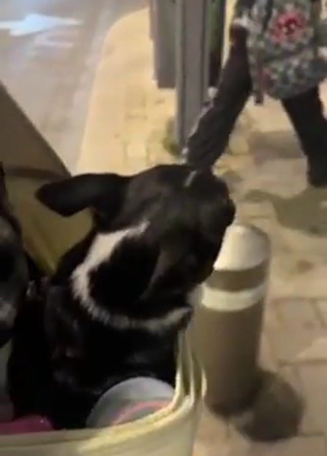 black and white Boston Terrier dog sitting in a carrier on a city street at night