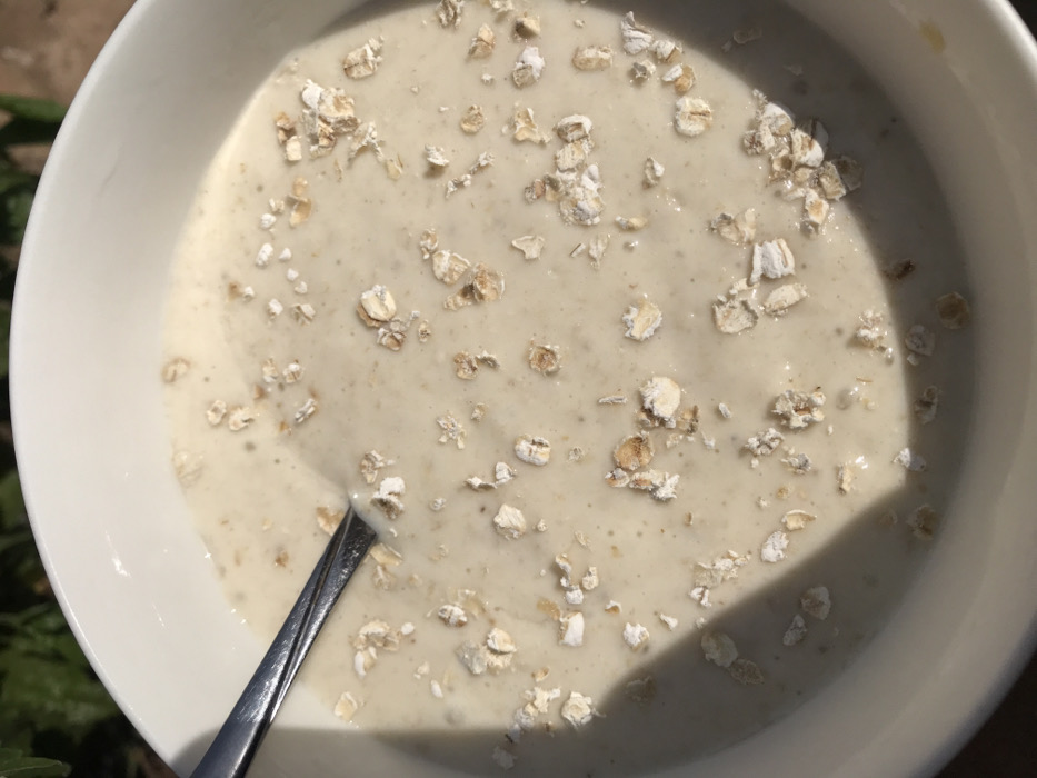 A white ceramic bowl containing a light beige, viscous substance, possibly porridge or oatmeal, is depicted