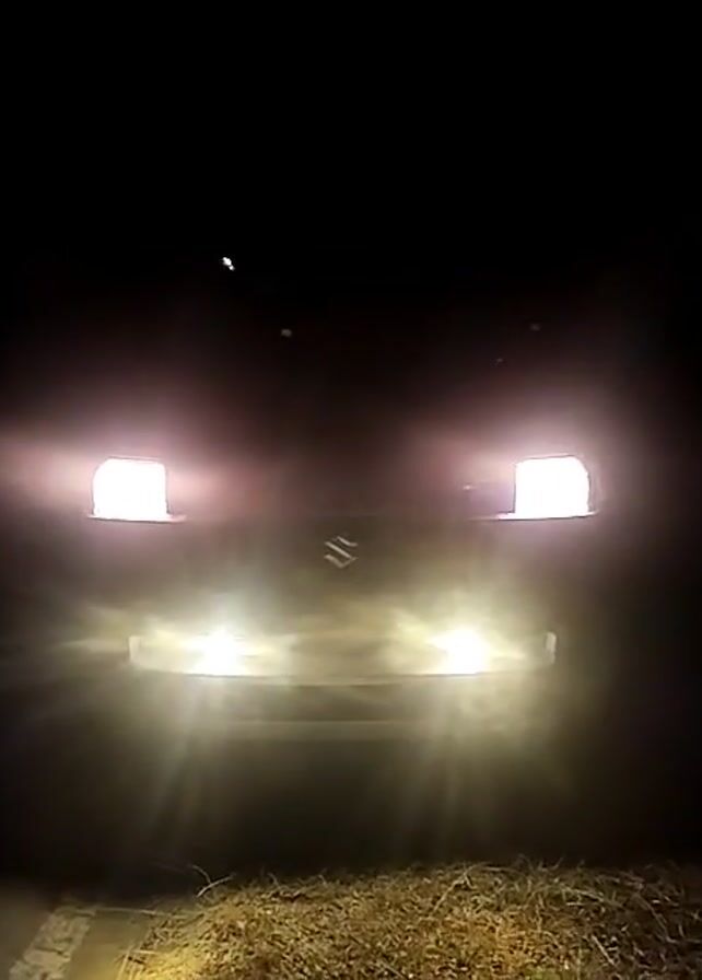 A stationary Suzuki ambulance is seen at night. Its headlights and auxiliary lights are on, illuminating the front grill and surrounding area. The background is dark, and the only visible elements are the road surface near the car. The video appears to be taken from a low angle.
