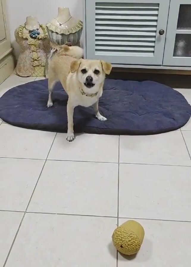 A small, tan-colored dog standing on a navy blue mat with a white tiled floor in the foreground is barking loudly. There is an acorn-shaped dog toy on the floor in front of the dog. Behind the dog, there are two dress form mannequins and a light blue cabinet with a collection of small figures on top.