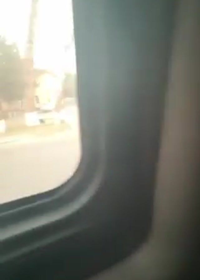view from the inside of a moving vehicle, presumably a car. The initial shot focuses on the interior, particularly the side panel and a portion of a seat. The camera then shifts to the window, revealing a street scene passing by. Buildings and trees are visible, indicating an urban or suburban environment. The camera quickly returns to the interior, capturing the seat and a glimpse of someone's leg wearing pink leggings. The focus of the video is inconsistent and seems to be taken from a casual, personal perspective.