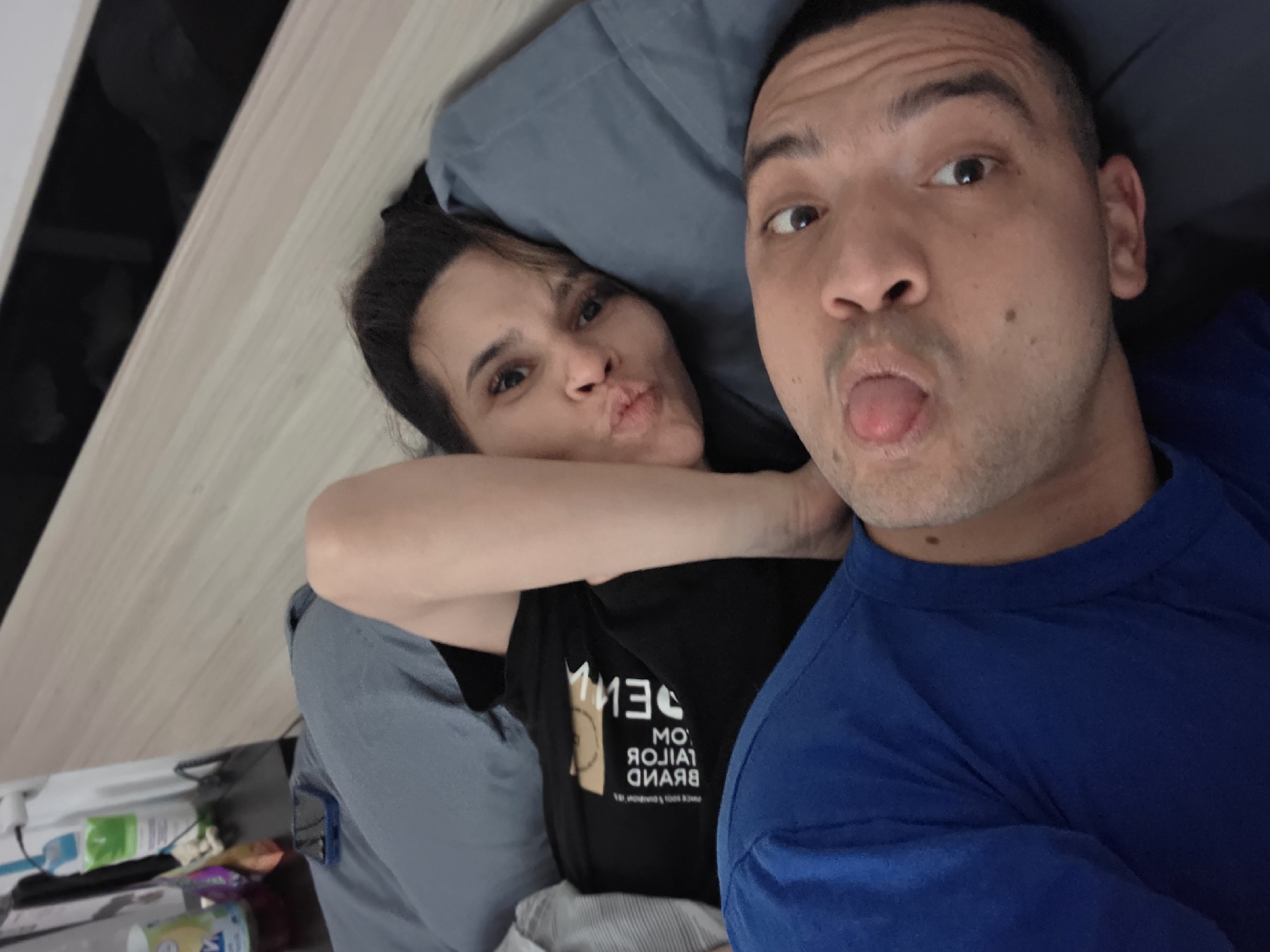 Two individuals, a male and a female, are posing in what appears to be an indoor setting, possibly a bedroom. The woman is positioned to the left, with her head resting on a bluish-gray pillow, and she is making a kissing face. She is wearing a black t-shirt with white lettering. Her right arm is raised and partially obscures her neck. The man is positioned to the right, closer to the camera, and he is sticking his tongue out. He is wearing a blue shirt. The background includes a light-colored wooden surface and, on the left side, items that suggest a shelf or a bedside table with various objects and toiletries. The location cannot be determined to be Veliko Tarnovo, Bulgaria, from this image.