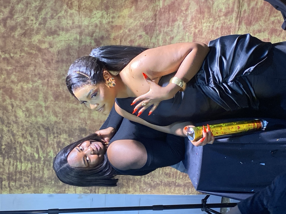 Two women, both in dark clothing, pose in front of a mottled brown and tan backdrop. The woman in the foreground wears a long-sleeved black dress and looks towards the viewer. The woman behind her, with hair in a high ponytail, wears a black top and a skirt or dress with draped fabric. She looks down and slightly to the side. Both women have bright red manicures. The woman in the front holds a gold-colored celebratory confetti popper. A small portion of the filming apparatus is visible in the bottom corner.