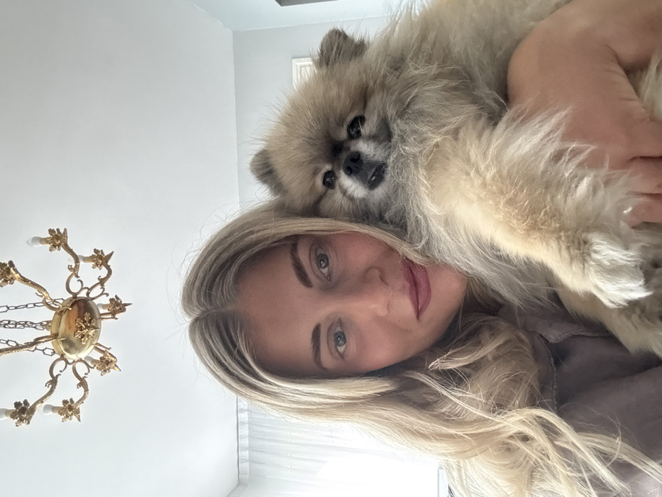 The image depicts an indoor scene in Wattrelos, France, featuring one adult female and one canine subject. The female, positioned on the left side of the frame, has long, wavy blonde hair with a central parting, light skin, and blue eyes. She wears a light-colored garment, and her gaze is directed towards the camera. She holds a small, fluffy Pomeranian-type dog with light brown fur and darker facial accents. The dog's head rests near the woman's shoulder, with its front paws visible on her arm, and its dark eyes also face the camera. Overhead, a multi-armed, gold-colored chandelier is suspended from a white ceiling. The background includes a white sheer curtain on the left and a light blue wall on the right, partially revealing a white framed object. The scene is brightly illuminated.