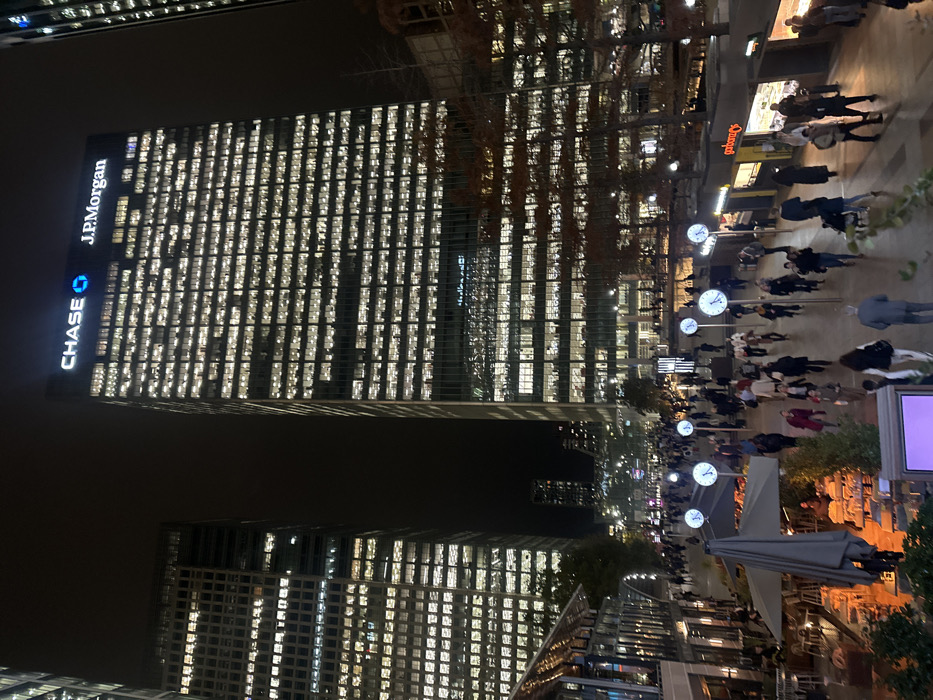 The image depicts a nighttime urban scene in Canary Wharf, London, United Kingdom. Two prominent, multi-story glass-facade skyscrapers stand illuminated against a dark sky. The taller, central building is identified by illuminated signage at its apex displaying "CHASE" and "J.P.Morgan." A wide, paved pedestrian promenade occupies the mid-ground and foreground, densely populated by numerous individuals walking in various directions. On the left, a building with a glass exterior houses a commercial establishment featuring an outdoor dining area with tables, chairs, and large grey umbrellas, some with visible overhead heaters. On the right side of the promenade, several smaller retail or food establishments are visible, including one labeled "Gourmet." The pedestrian area is brightly illuminated by streetlights, some of which are circular, clock-like fixtures mounted on poles, complementing the light from the buildings and businesses. Deciduous trees, appearing sparsely foliated, are situated along the promenade.