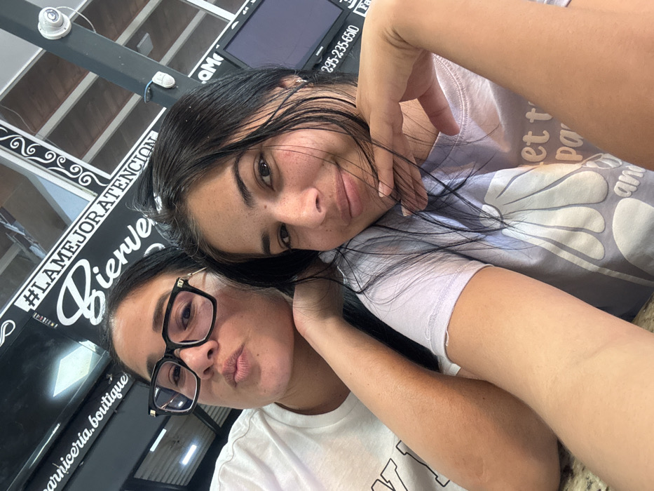 This image captures two young adult females inside a commercial establishment identified by overhead signage as a "carnicería boutique" (boutique butcher shop) in the city of Altagracia, Venezuela. The female on the left, wearing a white t-shirt and black-framed glasses, has dark hair and is looking at the camera with pursed lips. Her right forearm rests on a light-colored counter surface. The female on the right, also with dark hair, wears a light purple t-shirt featuring a grey graphic design and partially visible text. She is looking towards the camera with a subtle smile, her left hand positioned under her chin. The background consists of black structural beams adorned with white decorative patterns and white Spanish text, including "#LAMEJORATENCION" (The Best Attention) and "Bienvenido" (Welcome). A phone number, "0295-235-6510," is also visible. A white dome-shaped security camera is mounted to an overhead structure. The scene is brightly lit, consistent with an indoor commercial setting.