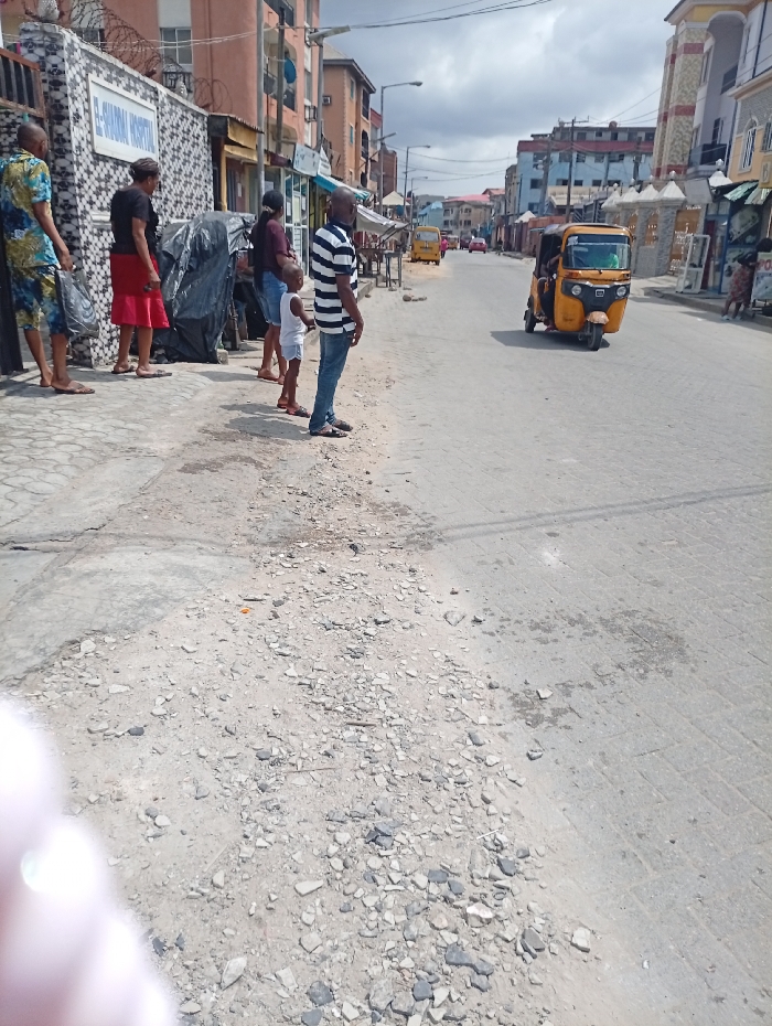 This image captures a daytime street scene in Ejigbo, Lagos, Nigeria, specifically on a road lined with commercial and residential buildings, with "AL-SHADAI HOSPITAL" clearly visible on the left. The sky is overcast. In the foreground, the street's edge and sidewalk are composed of loose gravel, dirt, and debris, transitioning to a paved, tiled surface on the sidewalk further back and a gray asphalt or paved road in the middle distance. On the left sidewalk, a group of five individuals stands. From left to right: a male in a blue and yellow patterned shirt and dark shorts, holding a black bag; a female in a black top and red skirt; a person in a dark shirt and blue shorts; a male in a white and blue striped polo shirt and blue jeans, looking towards the street; and a small child in a white top and shorts, standing beside the striped-shirt male, also looking towards the street. A large black tarp-covered object is situated behind these individuals. The hospital building behind them features a gray patterned wall topped with barbed wire. On the two-lane street, a yellow auto-rickshaw (Keke Napep) with visible passengers is in the right lane, heading away from the viewer. Another yellow auto-rickshaw and red vehicles are discernible further down the road. Buildings with multiple stories, varying facades, and ground-floor storefronts line both sides of the street. Streetlights and overhead utility lines are present. The scene depicts typical urban activity with individuals waiting or observing, and vehicles in motion.